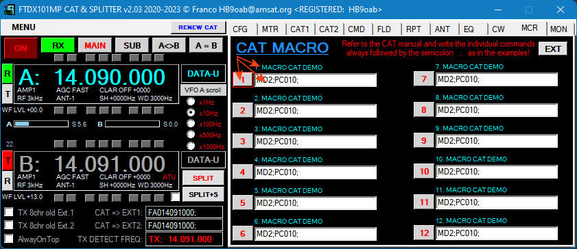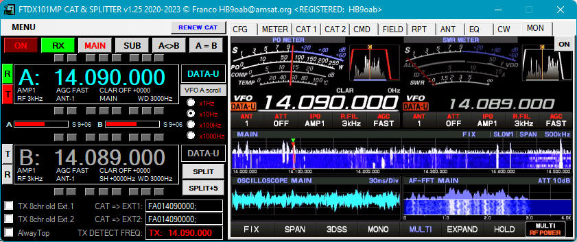 - Modificati i comandi CAT in particolare per FTDX101D/MP, perché passando da TX-A a TX-B in SPLIT, a causa di un difetto/mancanza nel firmware, sul display della radio (!!!) non sempre veniva evidenziata in rosso la frequenza sul RTX del VFO-B quando si attivava da CAT il RX-B, sia premendo SPLIT che il tasto "Tx" su A o B. L’errore/mancanza CAT consiste nel fatto che nel FW se NON sono presenti i comandi CAT sia ST; che FT;, il cambiamento del VFO-B in rosso non viene sempre confermato dal FW. Mentre premendo il tasto sulla radio SI. Questo problema è stato risolto con un algoritmo speciale interno a FdxCat&Splitter che aggiorna correttamente il segnale visivo della frequenza in ROSSO sul VFO B sulla radio anche quando selezionato da CAT.